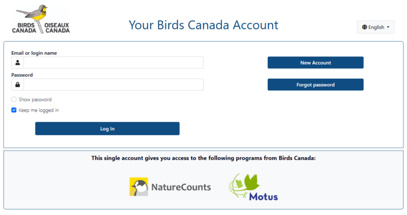 Some of the features of NatureCounts can be used without a login, but to download data you will need a Birds Canada account. Accounts are free and easy to create, and the same account will work for all Birds Canada programs including NatureCounts, Motus, Birds Canada Learn, and The Roost.
