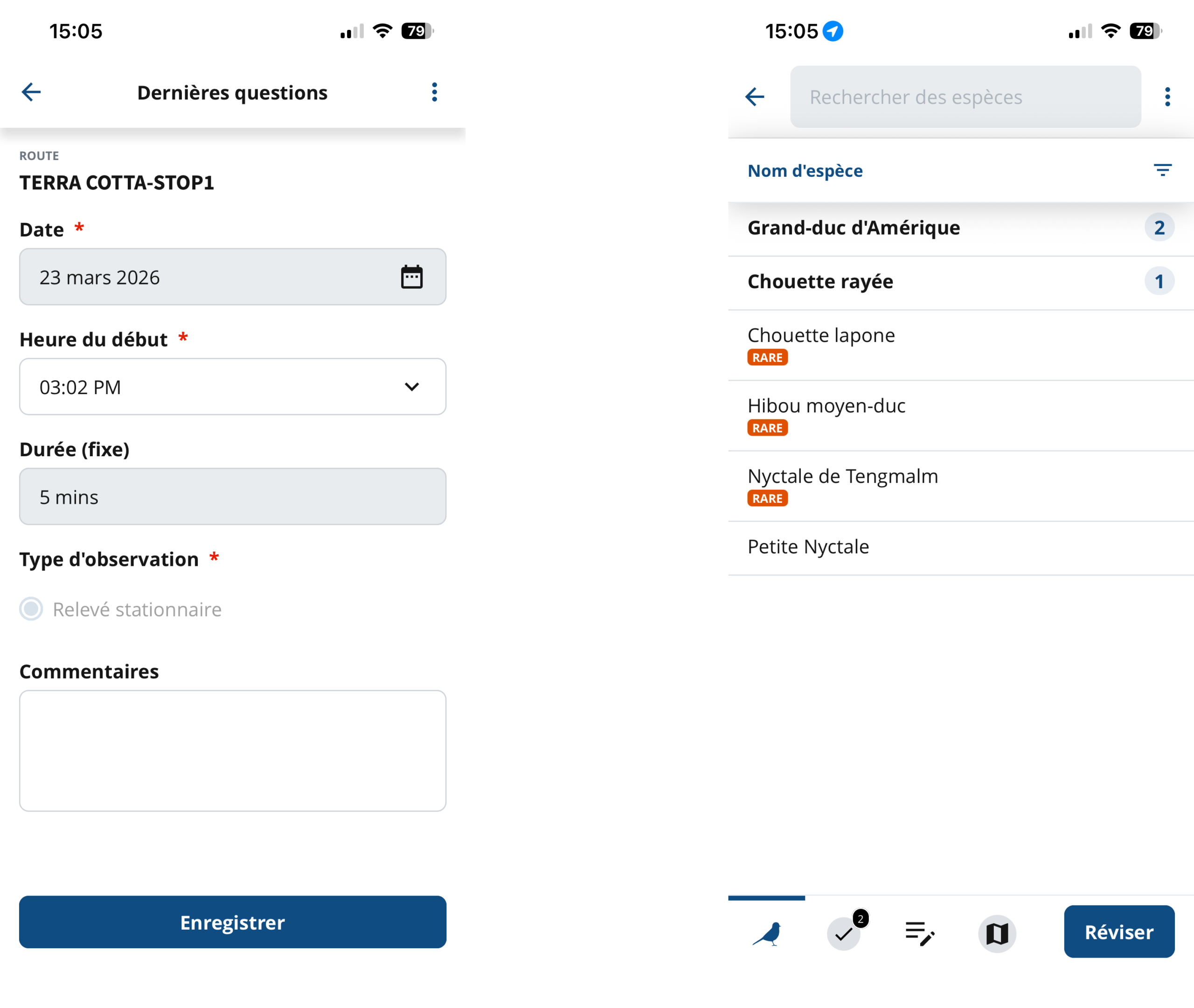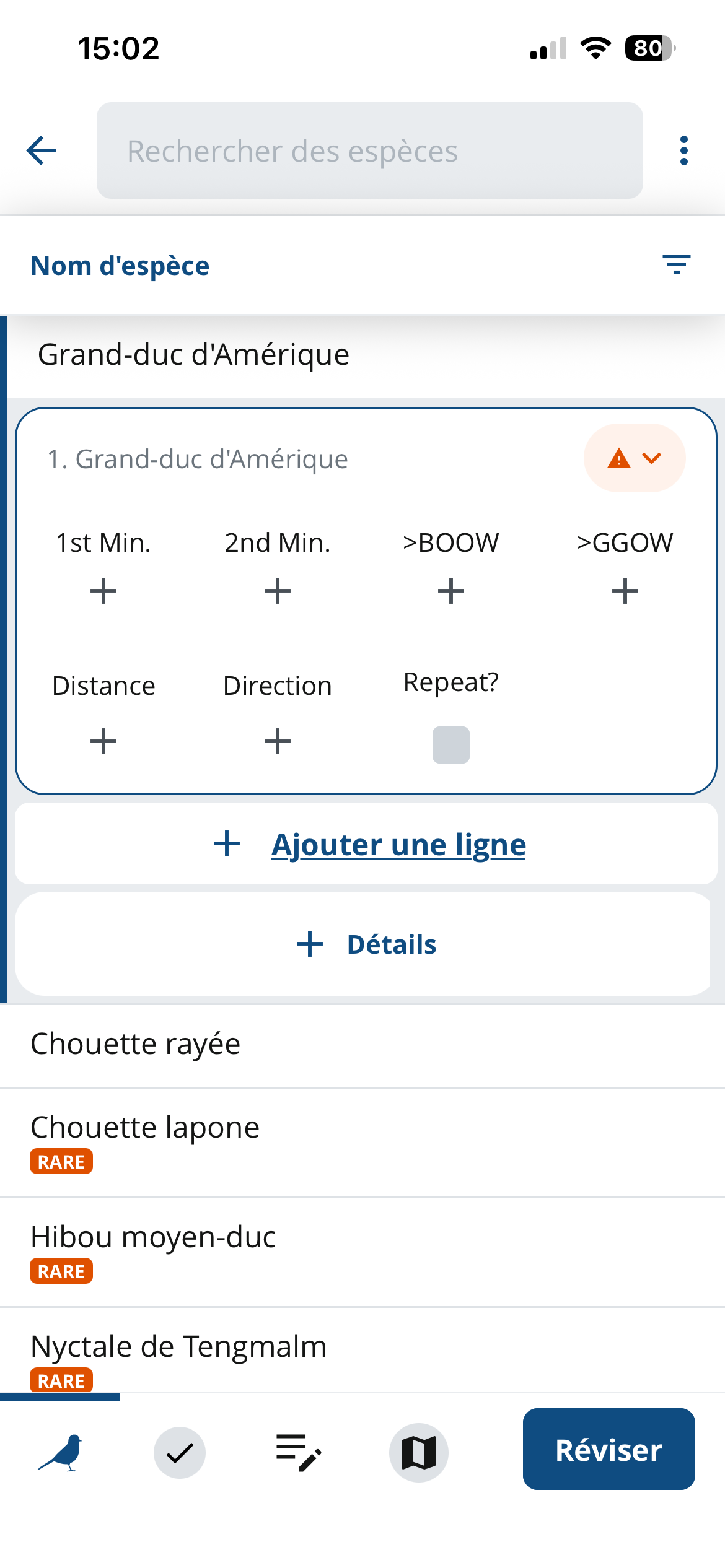 Il est important de se rappeler que, dans ce type de relevé, chaque observation concerne un seul individu. Pour ajouter un deuxième individu de la même espèce, appuyez sur «Ajouter une ligne» sous votre première observation. Pour saisir un individu d’une espèce différente, appuyez sur le nom de cette espèce. Une fois votre relevé terminé, appuyez sur «Réviser».