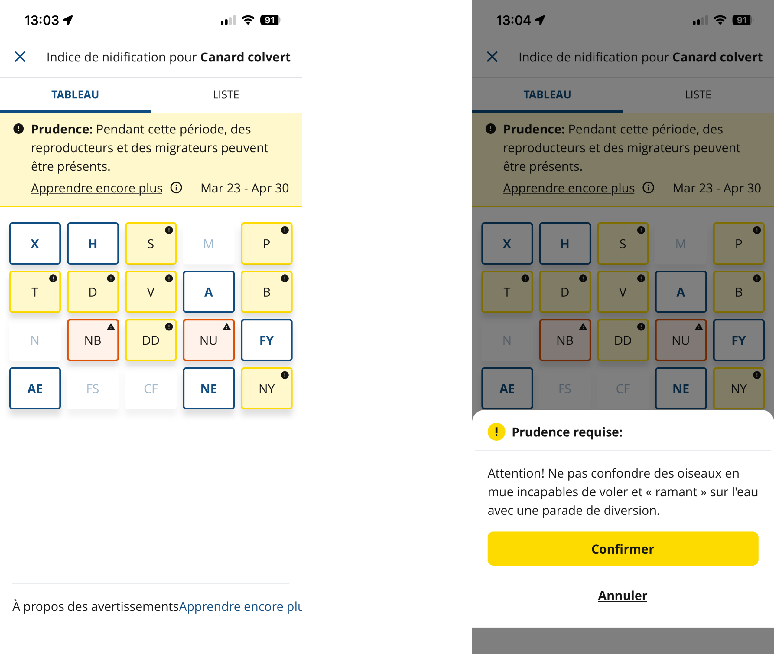 Si votre protocole comprend des indices de nidification, saisissez-les en appuyant sur la case «Ind. nid.» Les codes s’affichent par défaut sous forme de grille, mais vous pouvez voir une liste détaillée en appuyant sur «Liste» au haut de l’écran. Une bannière en haut indique si vous êtes dans la saison de reproduction de l’espèce sélectionnée. Les surlignages en jaune indiquent qu’un code doit être utilisé avec prudence pour une espèce donnée, et les surlignages en rouge indiquent qu’un code n’est probablement pas applicable. Les codes qui ne peuvent pas être utilisés pour l’espèce sont grisés.