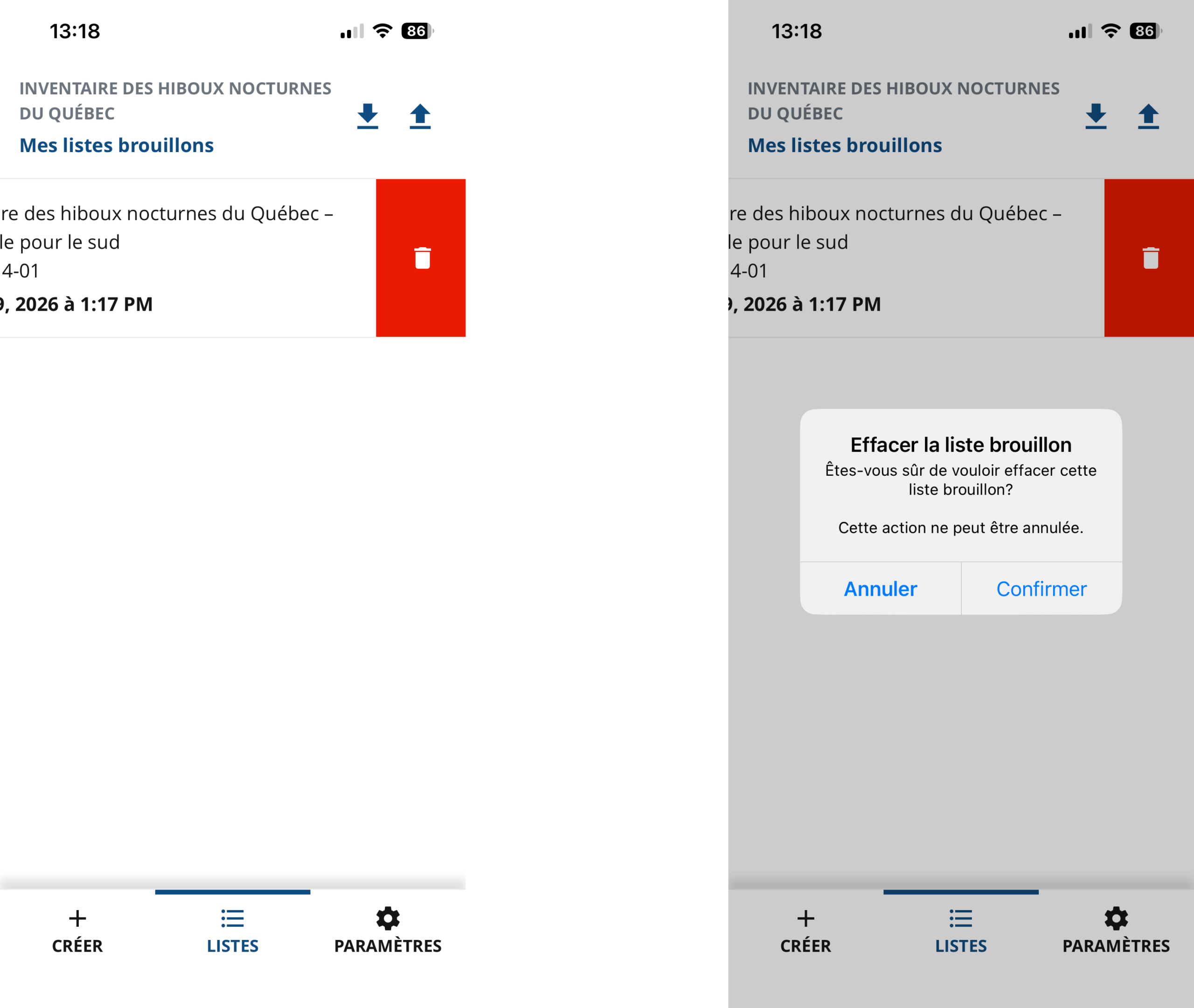 Pour supprimer un brouillon sous l’onglet LISTES, faites glisser la liste vers la gauche pour faire apparaître l’icône de la corbeille. Appuyez sur la corbeille et confirmez que vous souhaitez supprimer le brouillon.