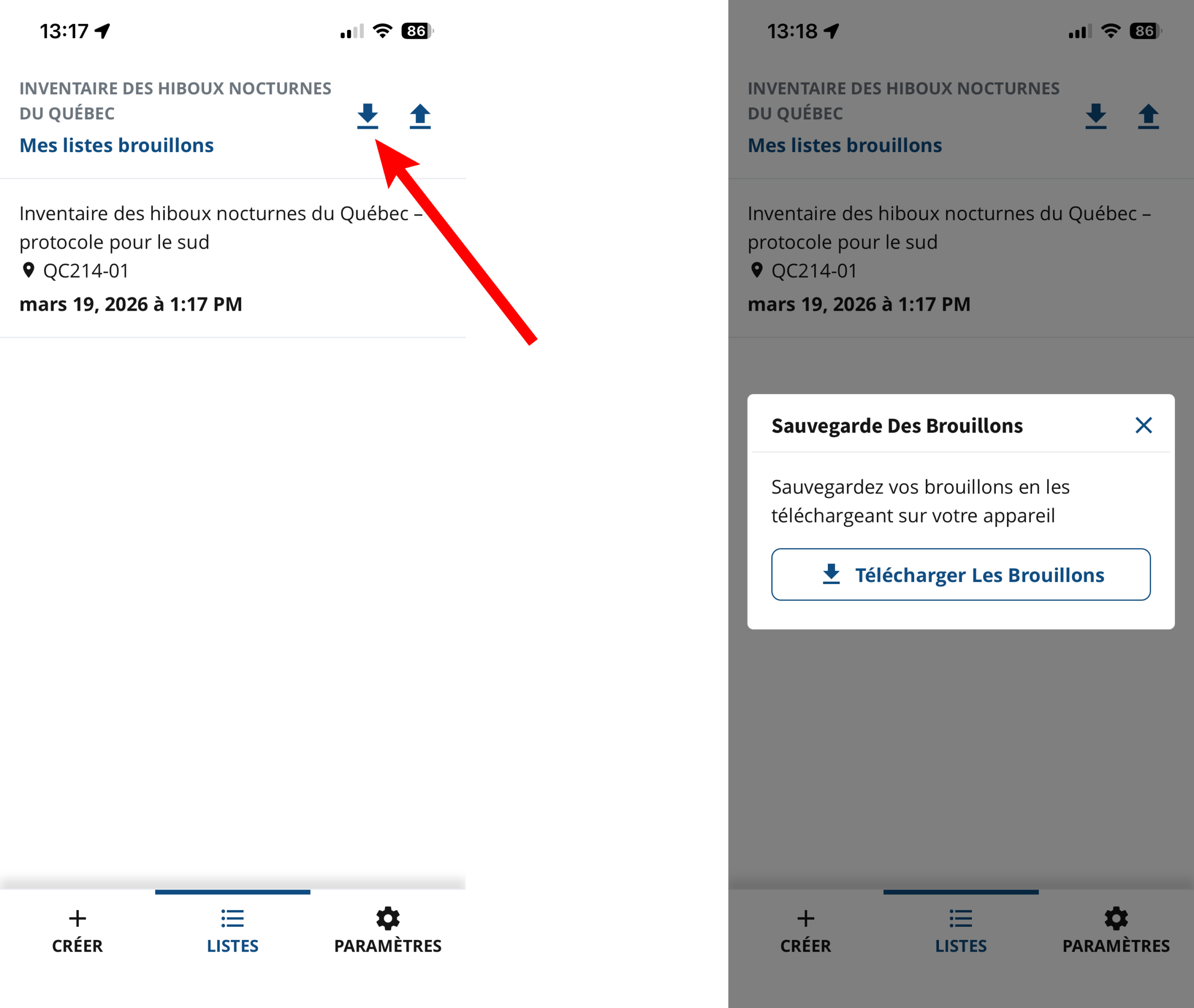 Si vous effectuez de nombreux relevés hors ligne, vous pouvez sauvegarder vos brouillons. Pour ce faire, appuyez simplement sur le bouton Télécharger sous l’onglet LISTES. Lorsque vous y êtes invité(e), appuyez sur «Télécharger les brouillons».