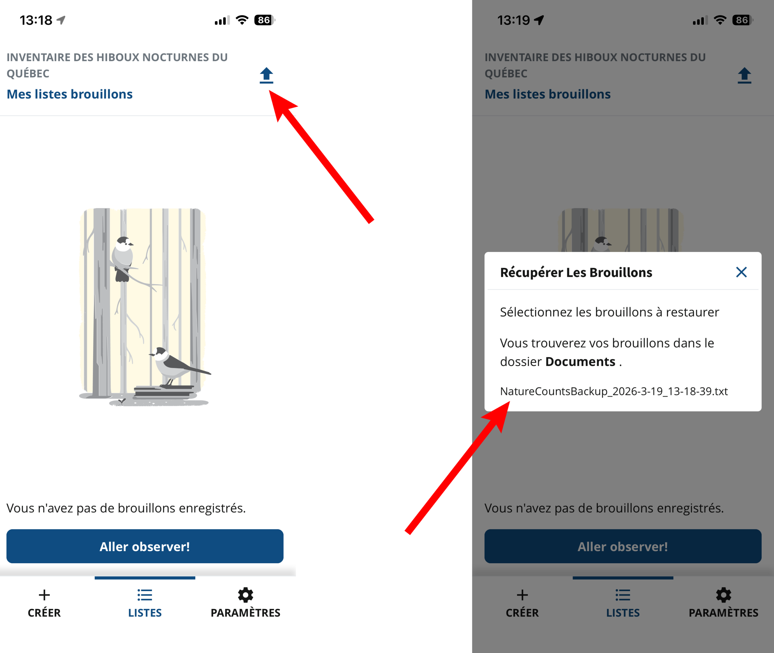 Pour récupérer vos brouillons, appuyez sur le bouton «Télécharger» sous l’onglet LISTES. Lorsque vous y êtes invité(e), sélectionnez le fichier de sauvegarde correspondant à la date de votre dernière sauvegarde. Sur l’écran suivant, appuyez sur «Retourner aux brouillons».